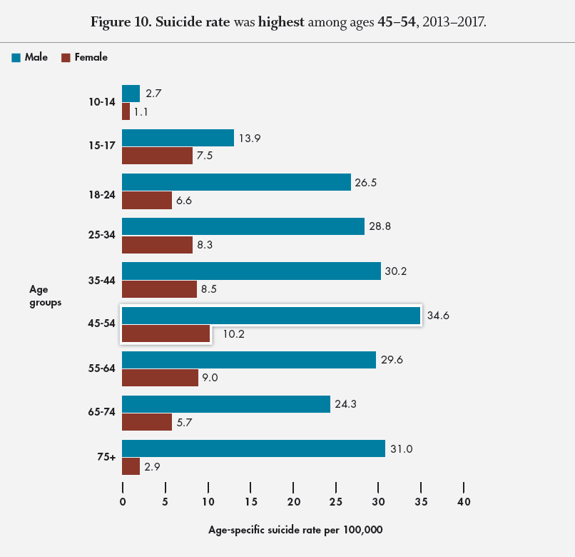 Figure 10. Suicide rates were highest for both males and females ages 45–54. Among females, suicide rates decreased after this peak for all older age groups. Among males, suicide rates decreased for the 55–64 and 65–74 age groups but then increased again for those 75 and older.