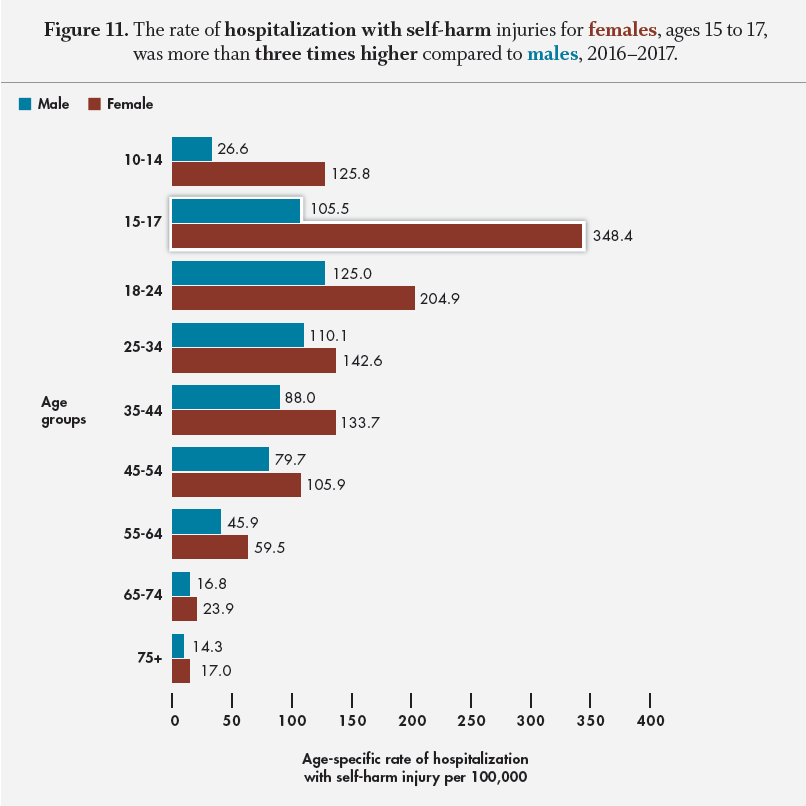 Figure 11. The population with the highest hospitalization rate with self-harm injuries was females ages 15–17. When considering only males, the rate of hospitalization with self-harm injuries was highest for those ages 18–24. Rates of hospitalization with