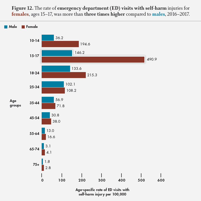 Figure 12. Rates of emergency department visits with self-harm injuries were highest among those ages 15–17 for both females and males. Rates of self-harm emergency department visits decreased after age 17 for both females and males.