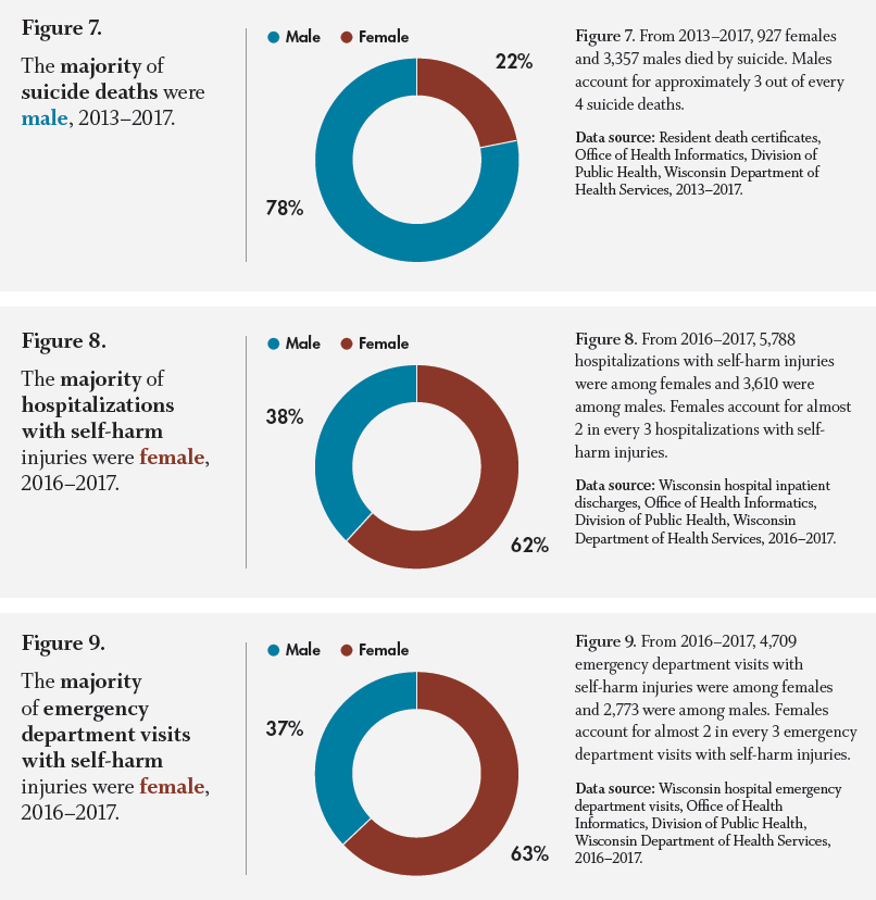 Suicide and self-harm injuries also vary depending on a person’s age. For the period of 2013–2017, suicide rates peaked for males and females ages 45–54. Many factors can contribute to this variation, including an increased likelihood of chronic disease, disability, or terminal illness, insufficient social support, access to lethal means, and feelings of isolation due to life circumstances in adults. Conversely, emergency department visits and hospitalization rates with self-harm injuries were highest among younger ages. Lower rates of suicide among youth may be related to limited access to more lethal means of suicide, such as firearms.